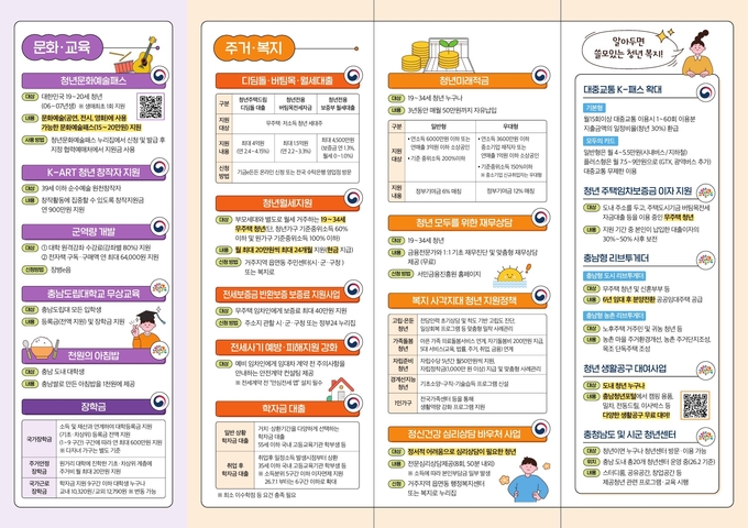 홍보 내용은 △케이(K)-패스 △청년 전용 보증부 월세 대출 △국가기술자격 시험 응시료 지원 △청년문화예술패스 △케이-아트(K-ART) 청년 창작자 지원 △천 원의 아침밥 △충남도립대 무상교육 △일 경험 지원사업 △청년창업사관학교 △충남형 청년인턴 △청년자립형 스마트팜 지원 △공공임대주택 △청년도약계좌 △충남형 도시·농촌 리브투게더 △청년 자살 예방 조기 검진 등 교육·일자리·주거·금융·복지·문화 분야까지 다양하다.