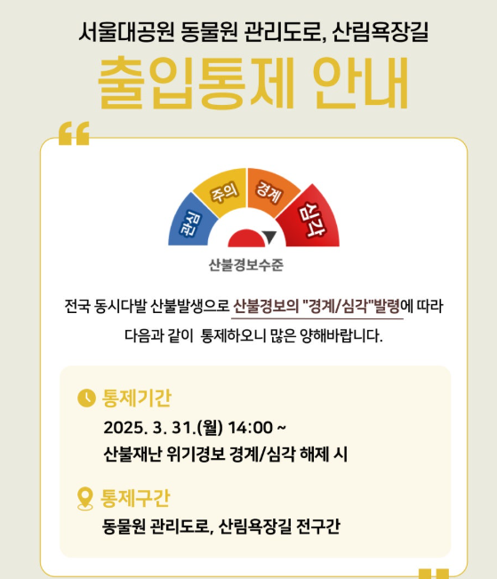 박진순 서울대공원장은 “산불은 예방이 최우선인 만큼, 5월 중순까지 대책본부를 중심으로 빈틈없는 감시 체계를 유지하겠다”며, “기상 상황에 따라 산림욕장길 등이 통제될 수 있으니 방문 전 홈페이지 안내를 반드시 확인해 주시고, 산불 예방을 위한 현장 수칙 준수에 적극 동참해 주시길 바란다”라고 말했다.