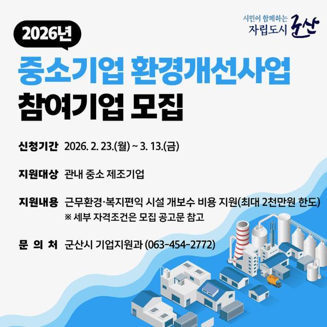 [군산/김주창기자] 군산시는 지역 내 중소 제조기업을 대상으로 ‘2026년 중소기업 환경개선사업’ 참여업체를 2월 23일부터 3월 13일까지 모집한다.