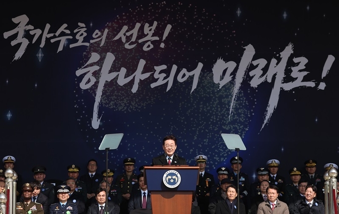 이 대통령은 이날 충남 계룡대 대연병장에서 열린 육·해·공군 사관학교 통합임관식 축사를 통해 "어떠한 상황에서도 스스로를 지켜낼 수 있는 나라, 그 누구도 감히 우리의 주권을 넘볼 수 없는 강한 나라를 만들기 위해, 강력한 국방력은 필수"라며 이 같이 밝혔다.