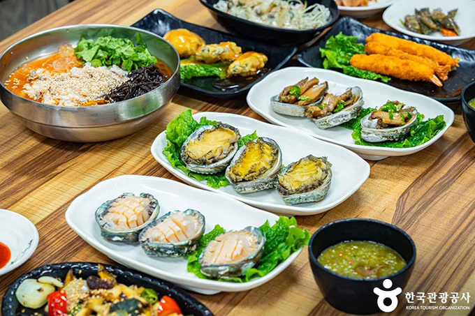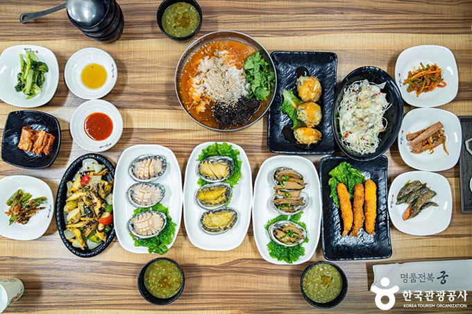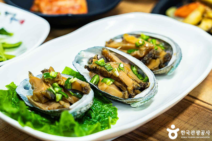 전복 양식장을 직접 운영해 신선한 전복을 맛볼 수 있으며, 전복으로 만들 수 있는 거의 모든 요리를 한 상에 차려주는 '전복한상'이 인기 메뉴다. 완도전통시장 내에 자리하며 규모가 커서 단체가 방문하기에도 좋다.