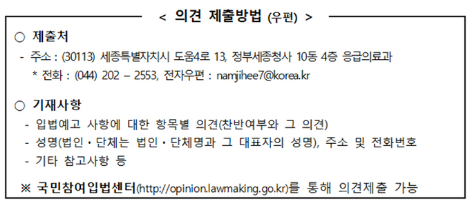 관련 의견은 4월 8일까지 보건복지부 응급의료과 또는 국민참여입법센터를 통해 제출할 수 있다.