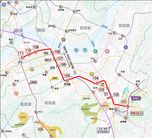 또한, 12월 개통 예정인 위례선 트램과의 연계를 통해 신도시와 서울 도심간 접근성을 향상시키고 위례중앙역과 신사역을 24분에 연결하여 기존 대비 32분 단축하는 등 이동시간도 절감할 것으로 기대된다.