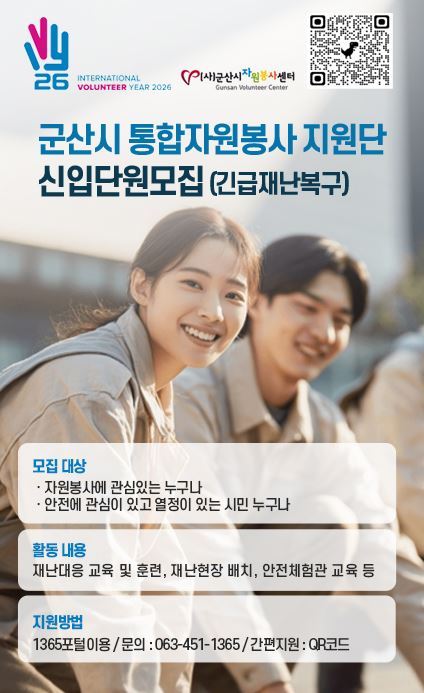 [군산/김주창기자] 군산시자원봉사센터(이사장 황진)는 각종 자연·사회 재난 발생 시 신속하고 체계적인 현장 지원을 위해 ‘통합자원봉사지원단’을 오는 4월 26일까지 모집한다고 밝혔다.