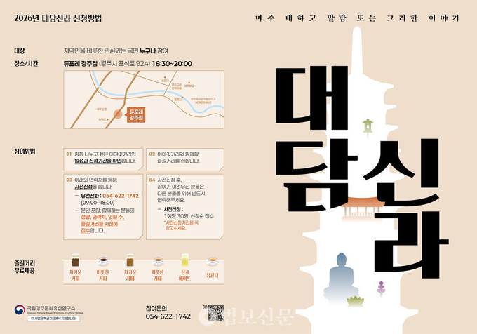 국가유산청 국립문화유산연구원 국립경주문화유산연구소(소장 임승경, 이하 ‘경주연구소’)는 ‘시민들과 마주 앉아 나누는 신라에 관한 이야기, 대담신라(對談新羅)’를 올해 네 차례(3.26./ 5.28./ 8.27./ 11.26.)에 걸쳐 진행하기로 하고, 그 첫 번째 행사를 오는 26일 오후 6시 30분, 경주 오릉 인근 카페에서 개최한다.
