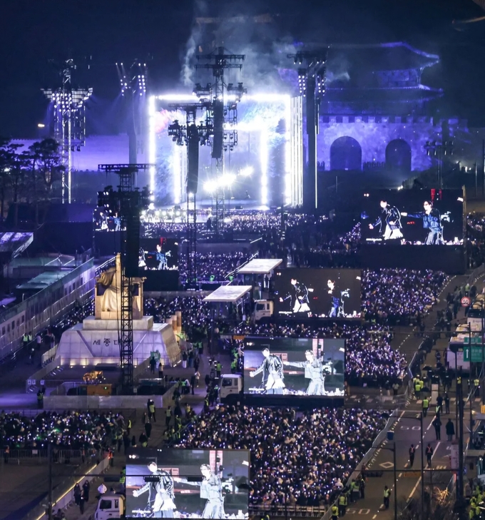 이날 방탄소년단은 광화문 월대를 지나 세종대로로 이어지는 길, 조선의 왕이 궁 밖으로 나올 때 걷던 ‘왕의 길’이자 우리의 600년 역사가 담긴 길을 통해 무대에 등장했다. 2022년 10월 부산 아시아드주경기장에서 열린 ‘옛 투 컴 인 부산’ 이후 3년5개월 만의 방탄소년단 완전체 무대이자, 한국의 평범한 아이돌 그룹으로 데뷔해 한국을 넘어 더 넓은 세계로 나아간 뒤 ‘케이(K)팝의 왕’이 되어 돌아온 방탄소년단의 서사를 보여주는 상징적인 장면이다.
