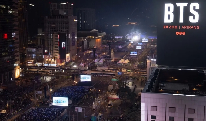 21일 저녁 8시 서울 광화문 월대 앞, 가지런히 손을 모은 검은 옷의 댄서들이 나팔 소리와 함께 양옆으로 흩어지자 흰색과 검은색의 의상을 입은 방탄소년단(BTS) 멤버들이 모습을 드러냈다. 리더 알엠(RM)이 “안녕하세요”라고 인사를 건네자 이들을 보기 위해 모여든 관객들은 보라색 응원봉을 흔들며 함성을 내질렀다. 곧이어 무대에 오른 방탄소년단은 지난 20일 발매된 정규 5집 ‘아리랑’의 ‘보디 투 보디’에 맞춰 자유로운 몸짓으로 무대를 누볐다. 광화문광장부터 시청역까지 1㎞의 거리가 보라빛으로 물들며 공연장으로 변신했다.