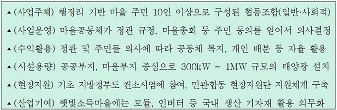 한편 햇빛소득마을은 마을 주민 10인 이상이 협동조합을 구성해 마을 내 유휴부지에 태양광발전소를 설치·운영하는 사업으로, 주민이 주도하고 지역이 함께 혜택을 공유하는 마을 태양광 모델이다.