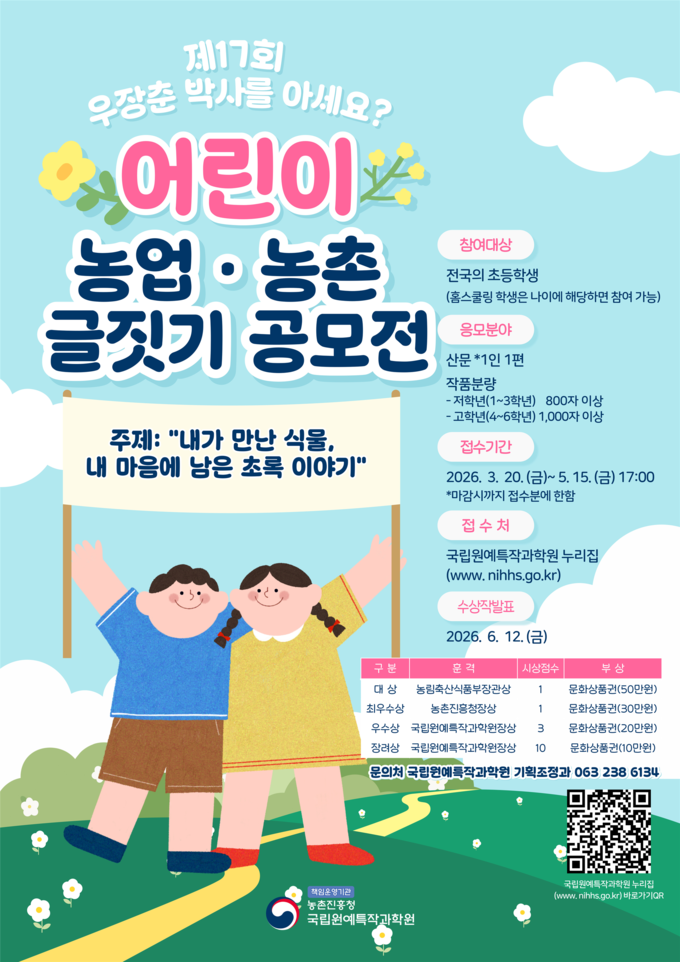 농촌진흥청(청장 이승돈) 국립원예특작과학원은 ‘우장춘 박사를 아세요? 어린이 농업․농촌 글짓기 공모전’ 참가작을 5월 15일까지 접수한다.