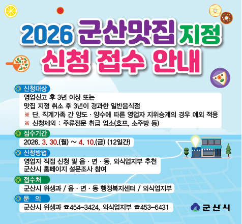 기타 자세한 사항은 군산시 홈페이지www.gunsan.go.kr) 또는 시청 위생과 식품위생계(☎063-454-3424)로 문의하면 된다.