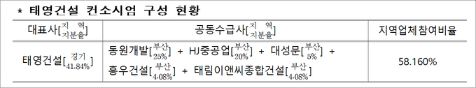 태영건설 컨소시엄⁎의 지역업체 참여 비율은 58퍼센트(%)로 법적 기준인 39퍼센트(%)보다 크게 높아 공사비의 지역 내 환류로 지역 건설업체 경쟁력 강화, 지역 인력 고용 증가, 장비‧자재‧운송 등 연관 산업 활성화, 주변 상권 활성화 등 지역경제 선순환 효과가 기대된다.