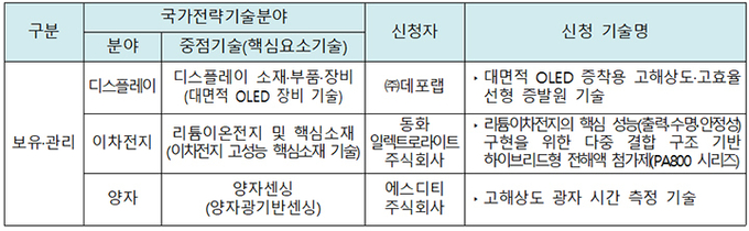 먼저, 디스플레이 분야에서는 '데포랩'이 보유·관리하고 있는 '대면적 OLED 증착용 고해상도·고효율 선형 증발원 기술'이 국가전략기술 디스플레이 분야의 세부중점기술인 디스플레이 소재·부품·장비에 해당하는 것으로 확인됐다.