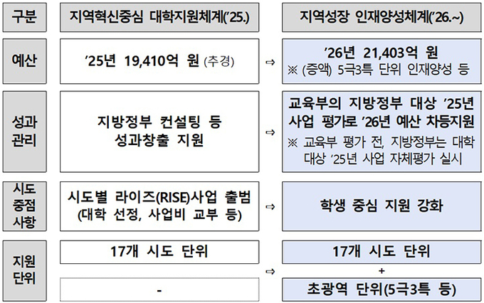 이를 위해 지역 내 예산 나눠먹기 등 부적절한 사업 운영을 타파하고 지역학생과 인재가 체감할 수 있는 내용 중심으로 세부 사업을 재편하며, 지방정부 간 칸막이를 넘어선 초광역 단위의 인재 양성을 확대해 갈 계획이다.