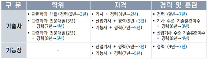 특히 현재 기술사·기능장 시험에 응시하기 위해서는 최대 9년의 경력이 요구돼 평균 44.8세에 기술사를 취득하는 등 고령화가 심화되고 있는 만큼, 이를 현행 대비 2~4년씩 단축한다.
