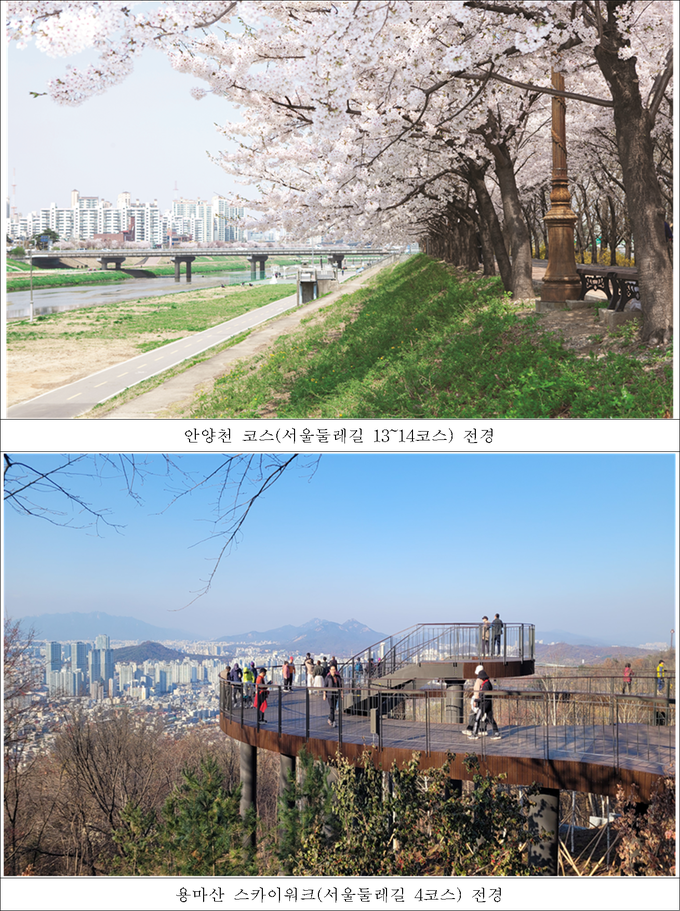 봄철에는 벚꽃 경관이 돋보이는 안양천 코스(13~14코스)를 걸으며 계절의 변화를 체감할 수 있으며, 새롭게 조성된 망우·용마산 코스(4코스) 내 ‘용마산 스카이워크’에서는 서울의 풍경을 한눈에 조망하는 색다른 경험을 할 수 있다.