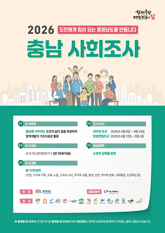 [충남/오창환기자] 충남도는 오는 8일부터 5월 4일까지 도내 1만 5000가구를 대상으로 ‘2026 충남 사회조사’를 실시한다고 7일 밝혔다.