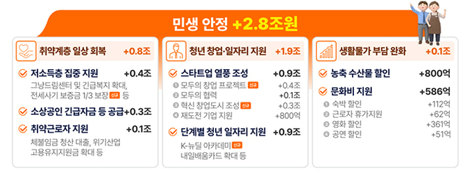 이에 정부는 이번 추경에서 '민생 안정 분야'에 총 2조 8000억 원의 예산을 배정했다. 취약계층 일상 회복 8000억 원, 청년 창업·일자리 지원에 1조 9000억 원, 고물가 부담 경감 1000억 원의 세 축으로 구성된다.