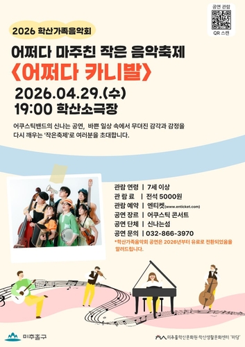 인천 미추홀구(구청장 이영훈) 학산 생활 문화센터 학산소극장에서 오는 4월 29일 저녁 7시 '2026년 학산 가족 음악회'의 첫 번째 공연을 개최한다.