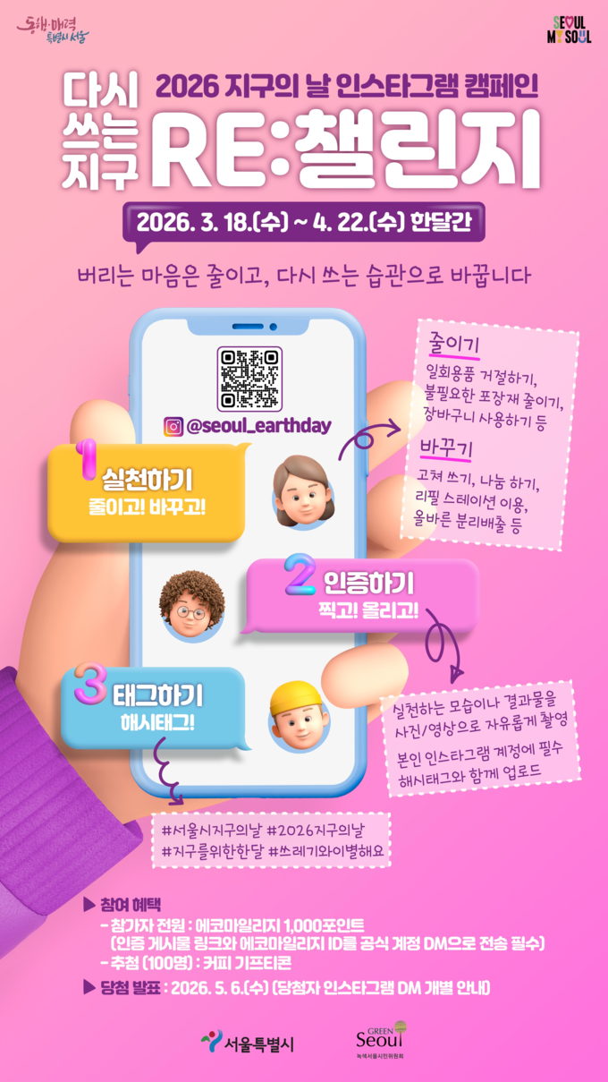 온라인에서는 3월 18일부터 지구의 날인 4월 22일까지 ‘다시 쓰는 지구 RE:챌린지’ 캠페인이 진행 중이다. 지구의 날 행사 참여 혹은 자원순환 실천 인증사진이나 영상을 인스타그램에 게시하고 지구의 날 공식 계정(@seoul_earthday)에 해당 링크와 에코마일리지 아이디를 보내면 에코마일리지 1천 포인트를 지급한다. 참가자 중 100명을 추첨해 커피 쿠폰도 제공한다.