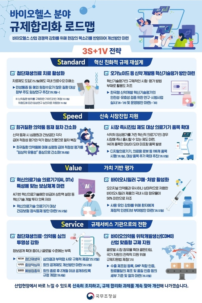 이와 함께, 국무조정실은 바이오헬스 산업의 국제 경쟁력 강화를 위해 마련한 바이오헬스 분야 규제합리화 로드맵을 발표했다.