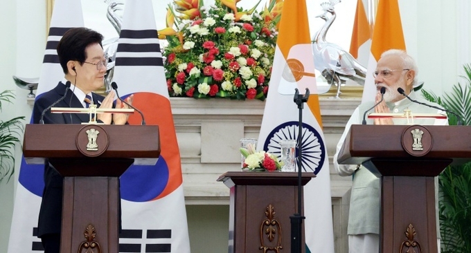 이재명 대통령과 나렌드라 모디 인도 총리가 20일(현지시간) 뉴델리 영빈관에서 공동언론발표를 하고 있다. 2026.4.20 (사진=연합뉴스)