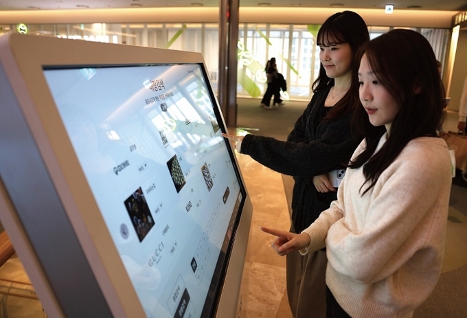 서울 송파구 롯데월드몰에서 방문객들이 배리어프리 키오스크를 이용해 매장을 검색하고 있다. 이 키오스크는 화면을 낮게 설치하고 음성안내 기능과 고대비·확대 기능도 갖췄다. 사진 롯데물산