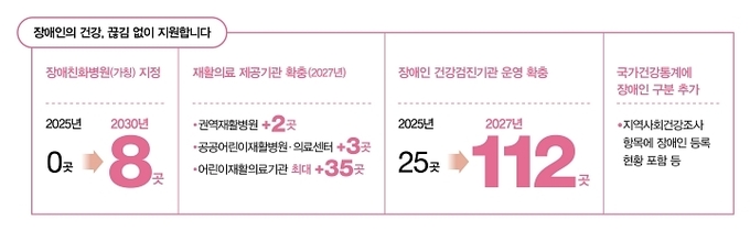 장애인 건강주치의 사업 활성화를 위해 방문재활을 도입, 서비스 범위를 넓힌다. 장애유형과 생애주기, 질환 특성을 반영한 건강 교육도 확대한다. 장애인 건강검진기관은 2030년까지 112곳 이상으로 늘린다. 검진 결과 유소견자에 대해선 지역장애인보건의료센터와 연계해 사후관리를 강화한다.