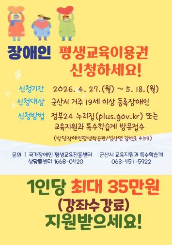 자세한 사항은 장애인 평생교육이용권 상담콜센터(1668-0420) 또는 군산시 교육지원과 특수학습계(063-454-5922)로 문의하면 된다.