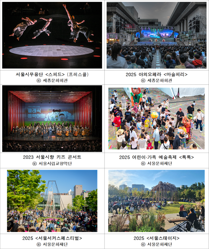 ▴<서울스테이지> (5.1./5.6./5.7., 서울숲) ▴어린이·가족 예술축제 <톡톡> (5.2.~5.3., 서울문화예술센터 양천, 서서울호수공원) ▴<서울서커스페스티벌> (5.4.~5.5., 노들섬) ▴<노들노을스테이지> (5.6.~5.9., 노들섬)