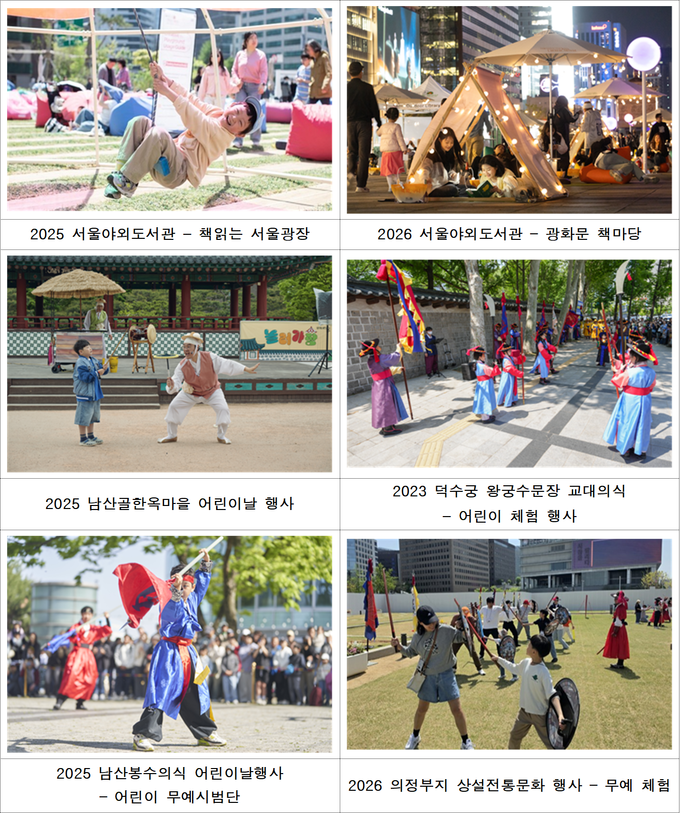 서울역사박물관 어린이박물관에서는 <한양에서 놀자!>(5.5.) 행사를 통해 공방·체험 프로그램 등이 진행되며, 경희궁에서는 독서 프로그램 <책 읽으라궁> (5.5., 5.10.)이 진행된다. 어린이 대상의 체험형 기획전시도 운영되고 있다.