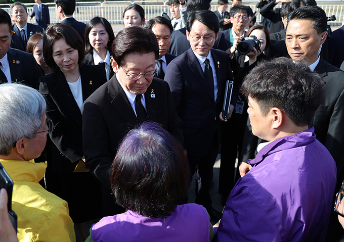 이재명 대통령이 16일 경기 안산 단원구 화랑유원지에서 열린 세월호 참사 12주기 기억식을 마친 뒤 이태원 참사 유가족을 위로하고 있다. 2026.4.16 (ⓒ뉴스1)