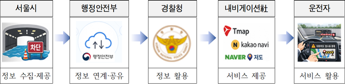 이번 서비스는 지하차도가 통제되면 서울시가 통제정보를 행정안전부의 ‘재난안전데이터 공유플랫폼’에 전송하고, 경찰청과 내비게이션 업체가 이를 연계해 운전자에게 실시간 안내하는 방식이다.