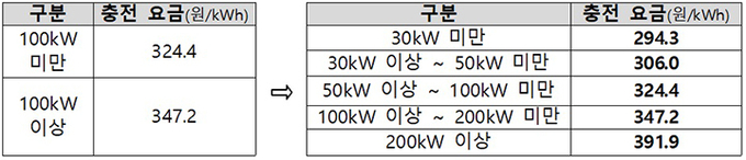 이에 기존 2단계 요금 체계에서 5단계로 세분화하면서 통신비와 유지보수비 등 충전시설 운영 비용 등을 반영해 요금단가를 조정한다.