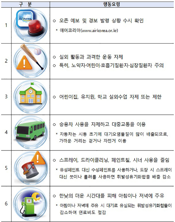 한편 국민건강 보호를 위해 학교, 어린이집, 어르신 보호시설 등 건강취약계층과 건설업, 청소업 등 옥외근로자를 대상으로 고농도 오존 발생 시 조치사항과 행동요령을 안내·교육할 예정이다.