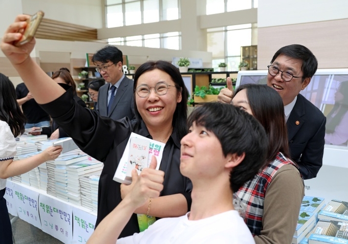 최휘영 문화체육관광부 장관이 29일 정부세종청사 15동 문체부 로비에서 세계 책의 날(4월 23일)을 기념해 직원들에게 책을 선물하고 함께 기념촬영을 하고 있다. 2026.4.29. (ⓒ뉴스)