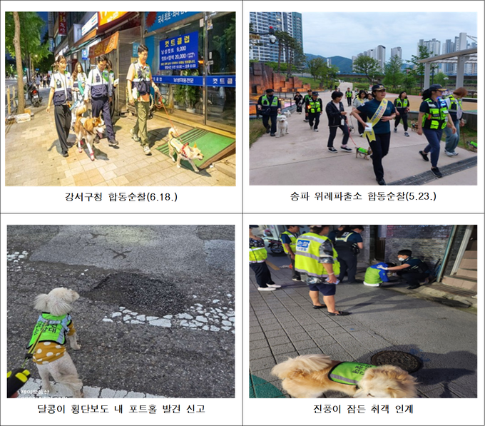 서울 반려견 순찰대는 2022년 64팀으로 시작해 2025년에는 1,529팀이 연간 8만 3,345회 동네를 순찰하며 ▴112 신고 153건(주취자, 접촉사고 신고 등) ▴120 신고 1,703건(가로등 파손, 보도블록 훼손 등 생활불편신고)을 신고해 지역 치안에 기여했다.