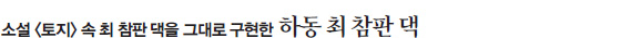 하동은 박경리의 대하소설 <토지>의 배경으로 알려졌다. 이를 바탕으로 평사리에 소설 속의 최 참판 댁이 그대로 구현됐다. 평사리는 지리선 능선이 둘러싼 산자락에 자리한 마을로 섬진강 물줄기가 굽이굽이 흐르고 넓은 평야가 드넓게 펼쳐져 소설 속 배경과 비슷한 느낌을 자아낸다. 최 참판 댁 대문을 들어서면 행랑채, 별당채, 별당 앞에 있는 작은 연못, 안채 등 작가가 상상한 저택이 그대로 눈앞에 펼쳐진다. 곳곳에 놓인 집기나 세월의 흔적이 담긴 나무 기둥 등 실제로 사람이 살고 있는 듯한 사실적인 분위기에 잠시 소설 속 한 장면이 떠오르기도 한다. 이곳은 SBS 대하드라마 ‘토지’를 시작으로 최근에는 ‘육룡이 나르샤’, ‘푸른 바다의 전설’, ‘구르미 그린 달빛’ 등의 촬영이 이뤄진 곳이다. 평소 드라마를 재밌게 본 시청자라면 드라마 장면 속 장소를 찾는 재미도 쏠쏠하다.