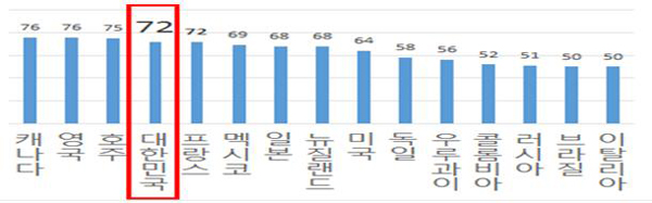 우리나라는 전년대비 총점이 62점→72점으로 10점 상승 하는 등 2013년 첫 평가 후 매년 점수가 상승했다.