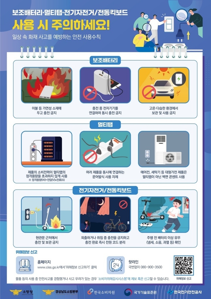 이에 캠페인은 고온·다습한 환경에서 보조배터리를 보관하거나 사용하지 않기, 멀티탭에 여러 제품을 동시에 연결하는 문어발식 사용 자제하기, 현관문 근처에서 전기자전거·전동킥보드를 충전하거나 보관하지 않기 등을 강조했다.