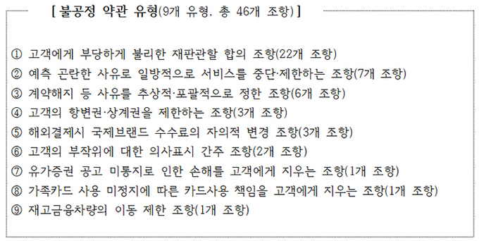 이 밖에도 '해지 사유를 지나치게 추상적으로 규정한 조항(6개)', '해외결제 브랜드 수수료를 임의로 변경할 수 있는 조항(3개)', '고객의 의사표시를 부작위로 간주하는 조항(2개)' 등 총 9개 유형이 시정 대상에 포함됐다.