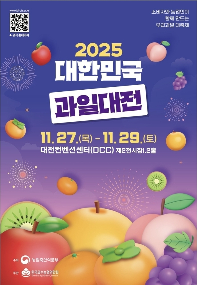 농림축산식품부(이하 농식품부, 장관 송미령)는 11월 27일(목)부터 29일(일)까지 3일간 대전 컨벤션센터(DCC) 제2전시장에서 「2025 대한민국 과일산업대전(이하 과일산업대전)」을 개최한다고 밝혔다.