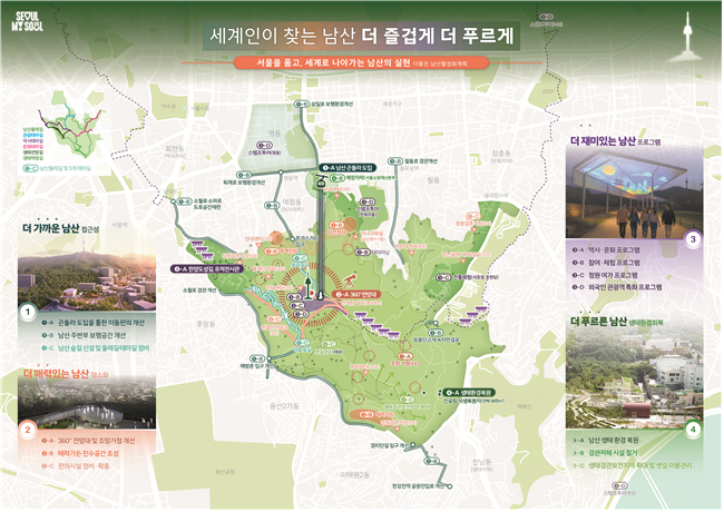 서울시는 남산을 세계인이 찾는 글로벌 명소로 재정비하기 위한 종합 대책 「더 좋은 남산 활성화계획」을 2일(화) 발표했다. 시는 남산 ▴접근성 개선 ▴명소 조성 ▴참여형 프로그램 ▴생태환경 회복, 4개 분야에서 총 13개 사업을 추진해 오는 '30년까지 도시경쟁력을 5위로 끌어올리겠다고 밝혔다.
