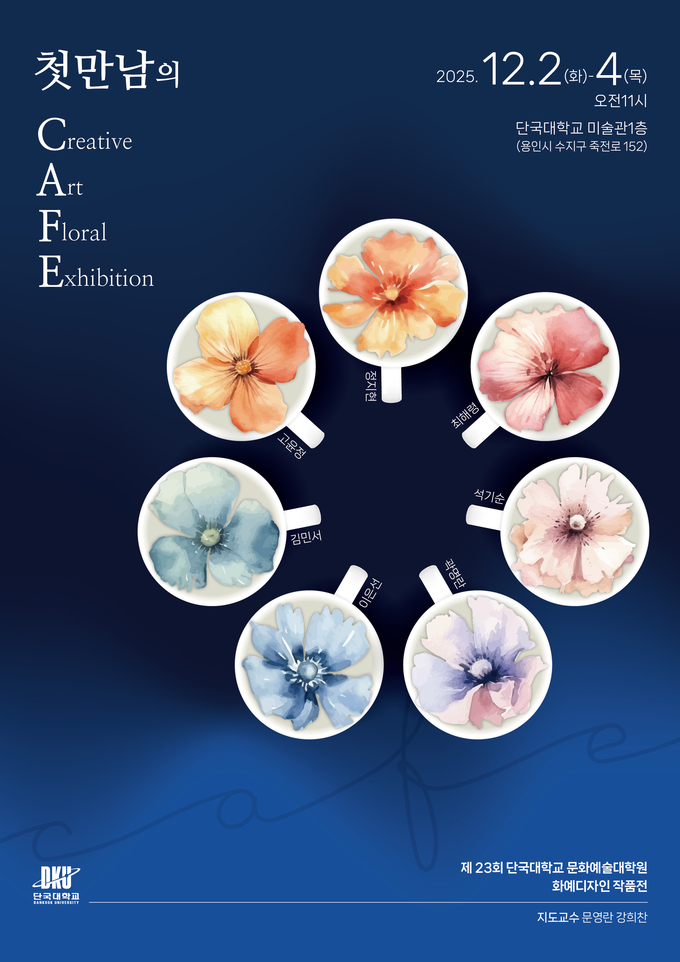 단국대학교 문화예술대학원 화예디자인 (원장 장유정, 화예디자인 주임교수 문영란)은 2025년 12월 2일부터 12월 4일까지 단국대학교 미술관에서 제 23회 작품전 <첫 만남의 CAFE>를 개최했습니다.