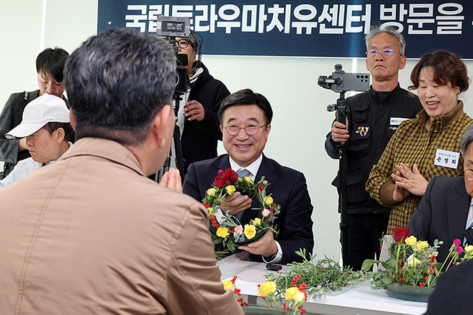 윤호중 행정안전부 장관이 광주 국립 국가폭력트라우마치유센터를 방문하여 유가족 피해자와 함께 원예 치유 프로그램에 참여하고 있다. 2025.11.10 (ⓒ뉴스1)