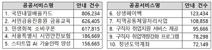 주요 알림 실적은 국민내일배움카드 80만 건, 서민금융진흥원 금융교육 62만 건, 서울시 시민안전보험 18만 건 등으로 정부 지원금과 교육·안전 관련 공공서비스를 주로 전달한 것으로 나타났다.