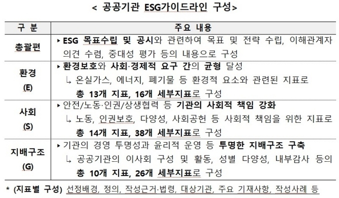 공공기관이 환경·사회·지배구조를 고려한 지속가능경영을 추구할 수 있도록 환경 13개 지표, 16개 세부지표, 사회 14개 지표, 38개 세부지표, 지배구조 10개 지표, 26개 세부지표 등 ESG 3대 분야에 모두 37개의 핵심지표와 80개 세부지표로 구성했다.