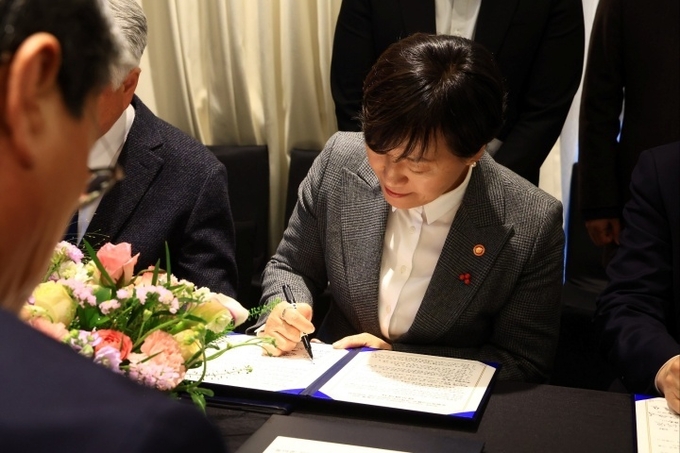송미령 농림축산식품부 장관이 29일 세종 코트야드호텔에서 열린 '농어촌 기본소득 시범사업 성과창출 협의체 출범식'에서 경제·인문사회연구원, 지방정부와의 업무협약서에 사인을 하고 있다. (농식품부 제공)