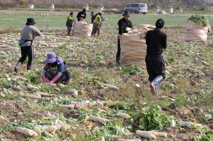 경북 고령군 개진면 무밭에서 농민들이 단무지용 무를 수확하고 있다. 2024.11.25. (ⓒ뉴스1)