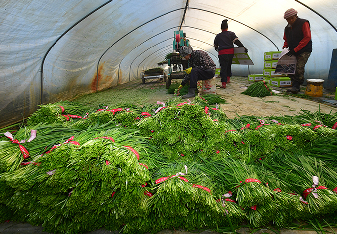 경북 포항시 남구 연일읍 부추단지에 있는 석이네 농장에서 외국인 근로자들이 제철을 맞은 부추(정구지)를 수확하고 있다. 2026.1.8 (ⓒ뉴스1)