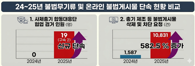 한편, 경찰청에서는 국내 불법무기류 단속(’24년 102명→’25년 112명)과 더불어 온라인상 총기 제조 관련 불법 게시물을 삭제·차단 요청(’24년 1,587건→’25년 10,831건)에 집중하여 일반인이 호기심에 범죄의 유혹에 빠지는 길을 방지하고자 노력하고 있다. 또한 규제 대상인 총기 부품을 추가 확대함으로써 사제총기 제작 시도를 차단하기 위한 「총포화약법」 시행령 개정도 추진 중이다.